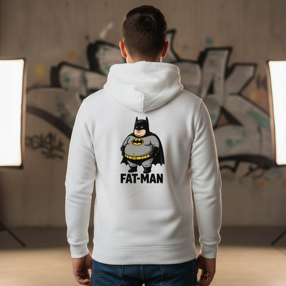 Add humor to your streetwear rotation with the TRBL “Fat-Man” White Hoodie, a clever parody twist on the classic superhero. Featuring a bold “Fat-Man” cartoon graphic on the back and a minimalist matching print on the chest, this hoodieis equal parts playful and stylish.